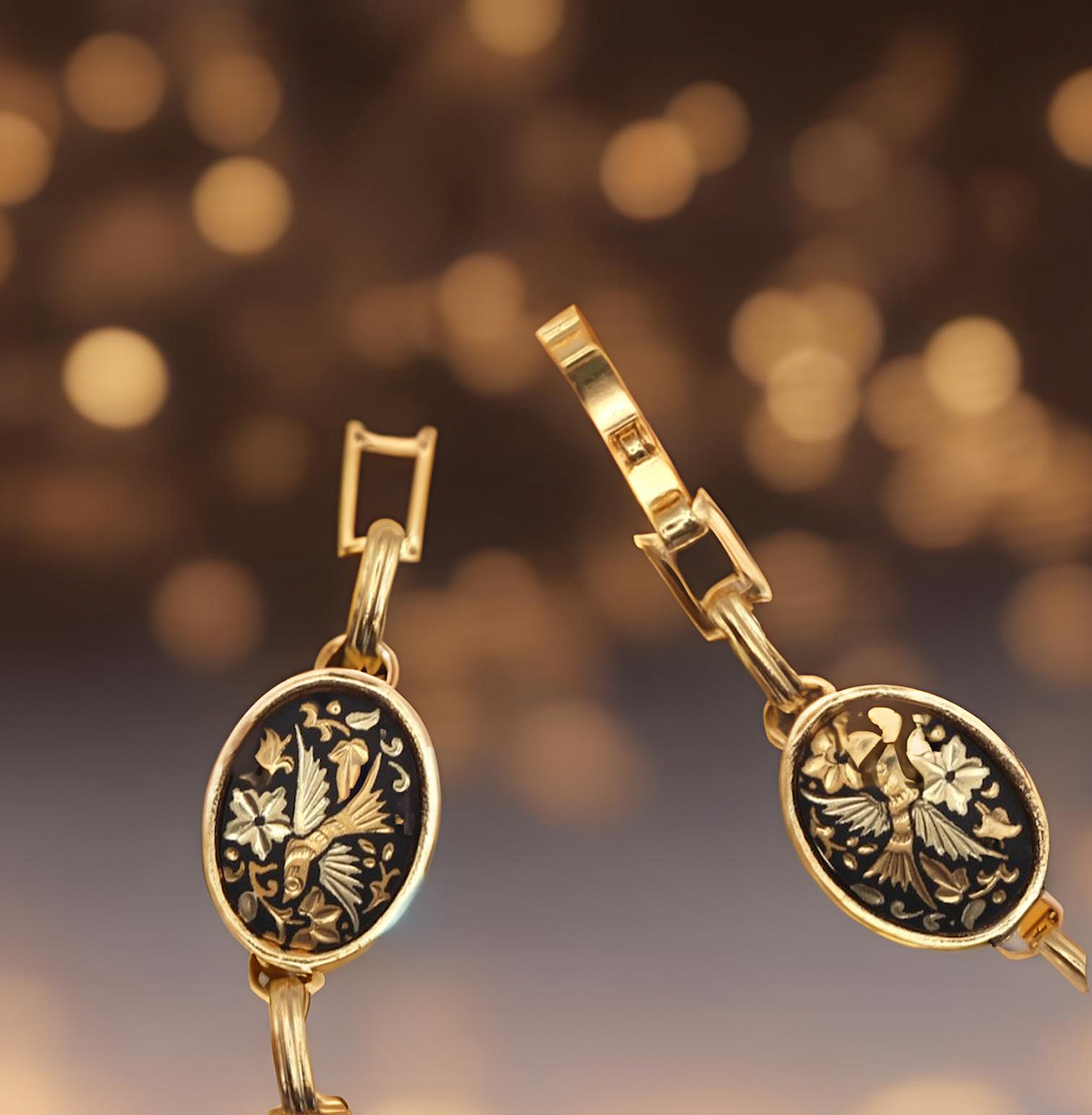 Give your outfit the perfect accent with this elegant damascene bracelet. Available in Renaissance (birds and flowers) design.