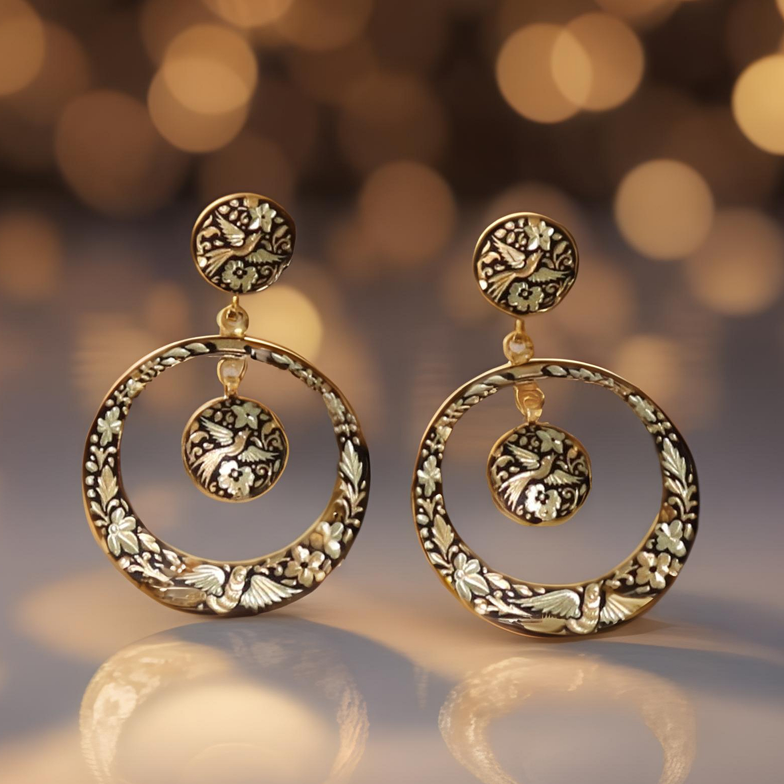 These elegant damasquino hoop earrings make a statement without weighing you down. Available in Renaissance (bird) or Arabesque (geometric) design. These earrings will be the perfect conversation starter at your next special event.