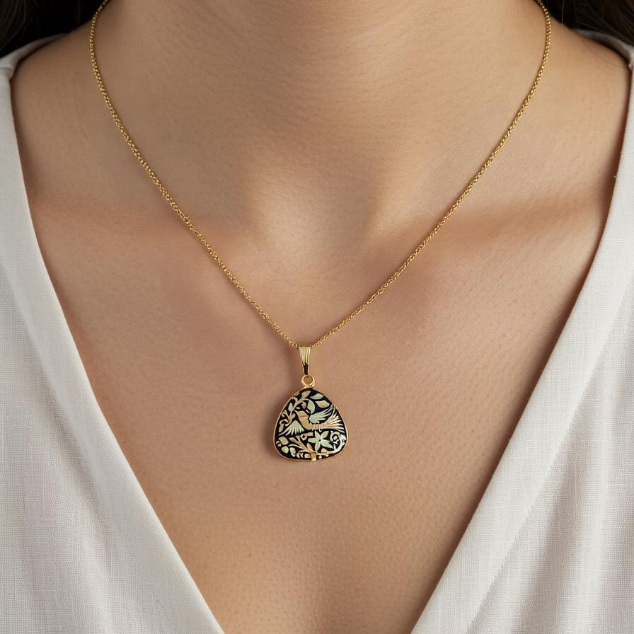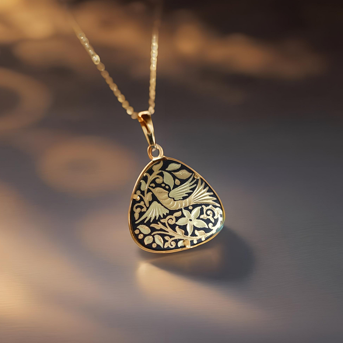Beautiful rounded triangle damascene pendant featuring a traditional Renaissance (bird) design. A stunning accessory for all occasions, this damascene necklace will instantly make your outfit more dramatic. This rounded triangle pendant is a one of a kind piece of jewelry. Damascene jewelry also makes a unique thoughtful gift.