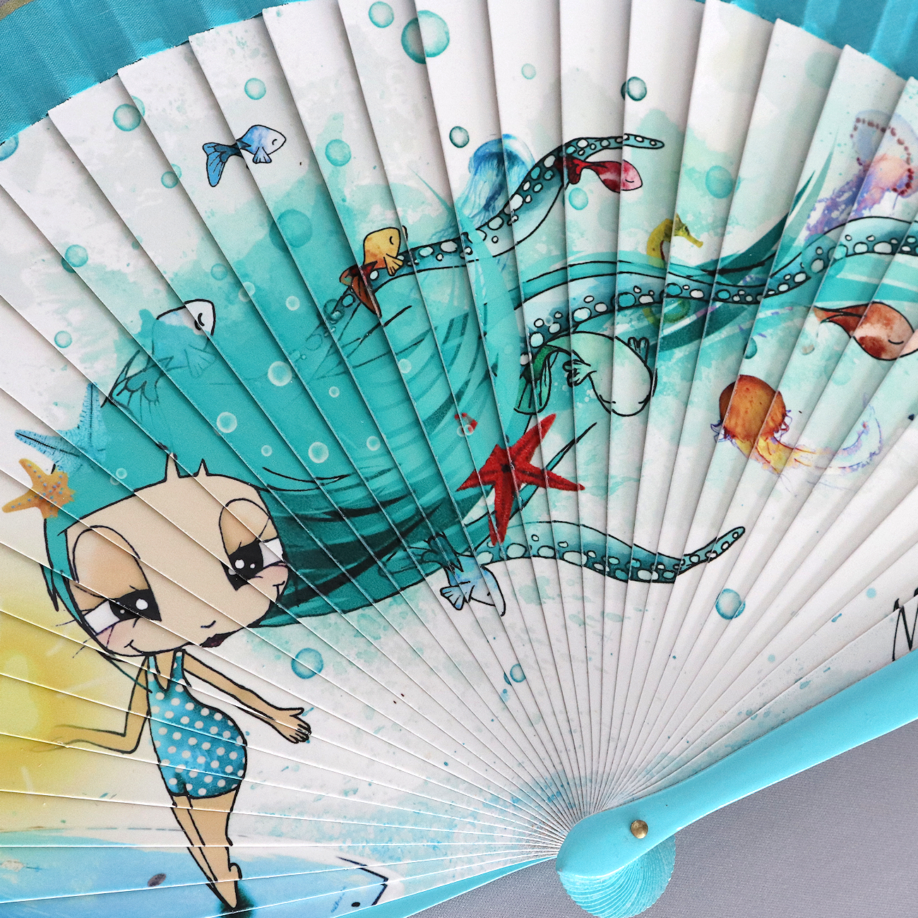 “Ocean Girl” hand fan by Malaka. This adorable print features a cute girl frolicking in the water. Casual with a contemporary feel, this fan perfectly combines style and function. Fun to carry in the summer time to cool off, as well as the perfect conversation piece. Makes an excellent gift.