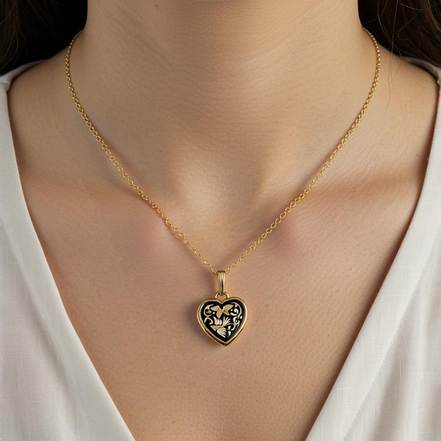Beautiful small heart damascene pendant featuring a traditional Renaissance (bird) design. A unique accessory for all occasions, this damascene necklace will instantly make your outfit more dramatic. This heart pendant is a one of a kind piece of jewelry. Damascene jewelry also makes a unique thoughtful gift.